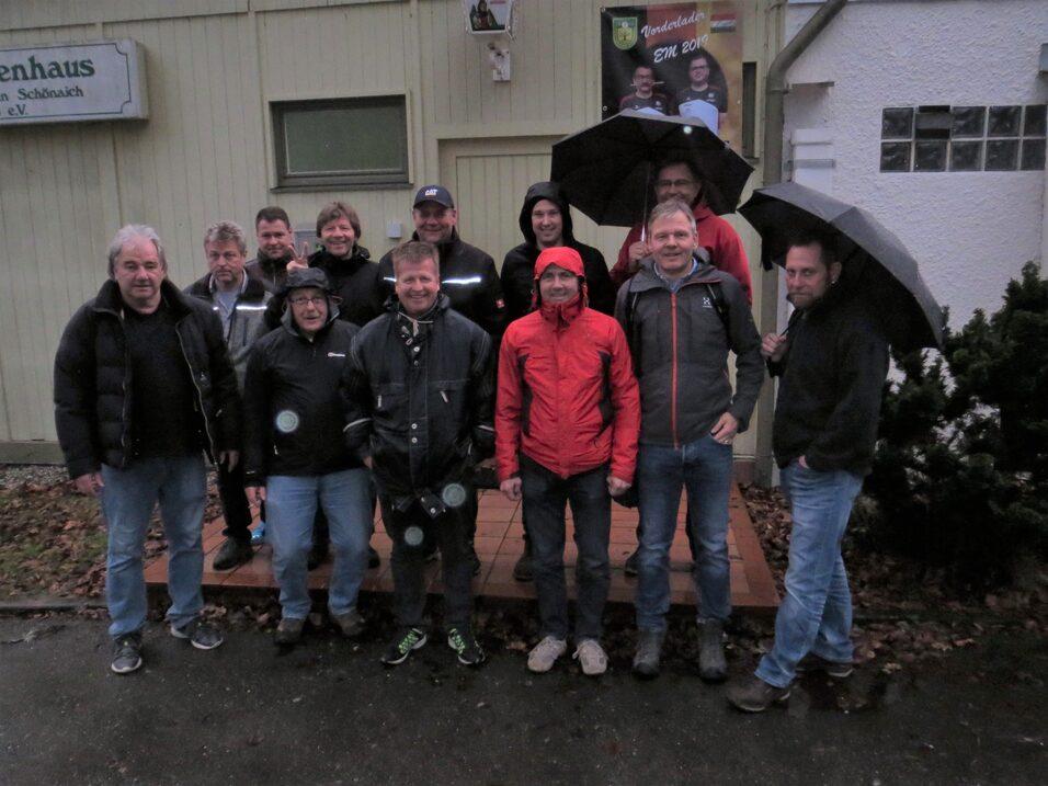 Bei grauem, regnerischem Wetter, nahmen wir Abschied und marschierten am Ortsrand entlang in Richtung Schönaicher First, zur Einkehr bei den „Eisenbahnern“, wo wir bereits erwartet wurden. Mit einer auserlesenen Speisekarte, konnte sich jeder Teilnehmer bereits im Vorfeld sein Essen auswählen, damit der Wirt es bei der Zubereitung von mehr als 20 Personen etwas einfacher hatte. Ein perfektes, reichhaltiges und wirklich leckeres Essen, darüber waren sich alle einig. Mit seiner ruhigen und freundlichen Art, hatte Gastwirt „Robert“ und sein Küchenteam, zu jeder Zeit alles im Griff und am Ende gab es noch eine Schnapsrunde obendrauf. Ein Großteil der Gruppe lief selbstverständlich zu Fuß wieder über die alte Schönaicher Straße zum Heimatort zurück.