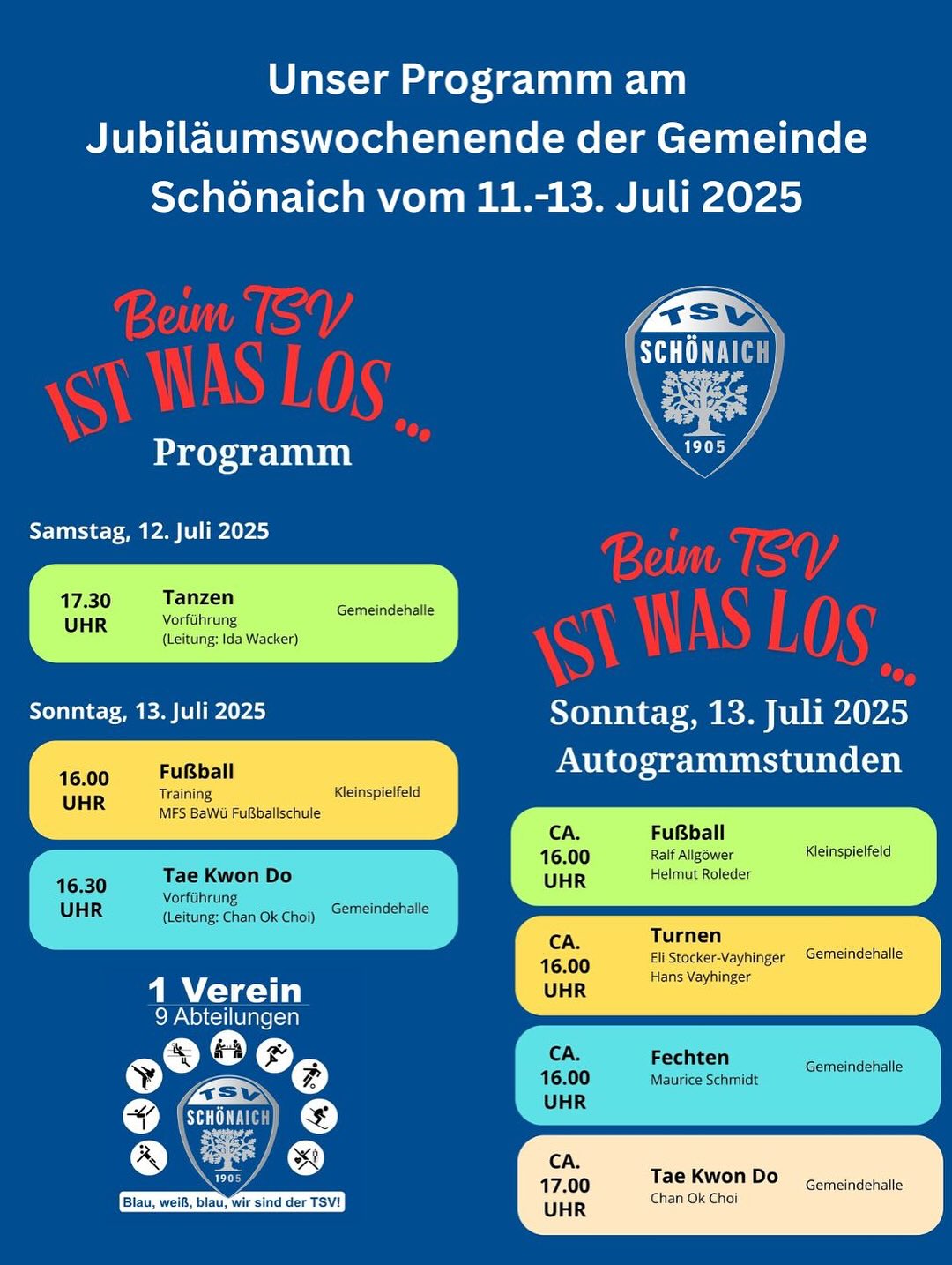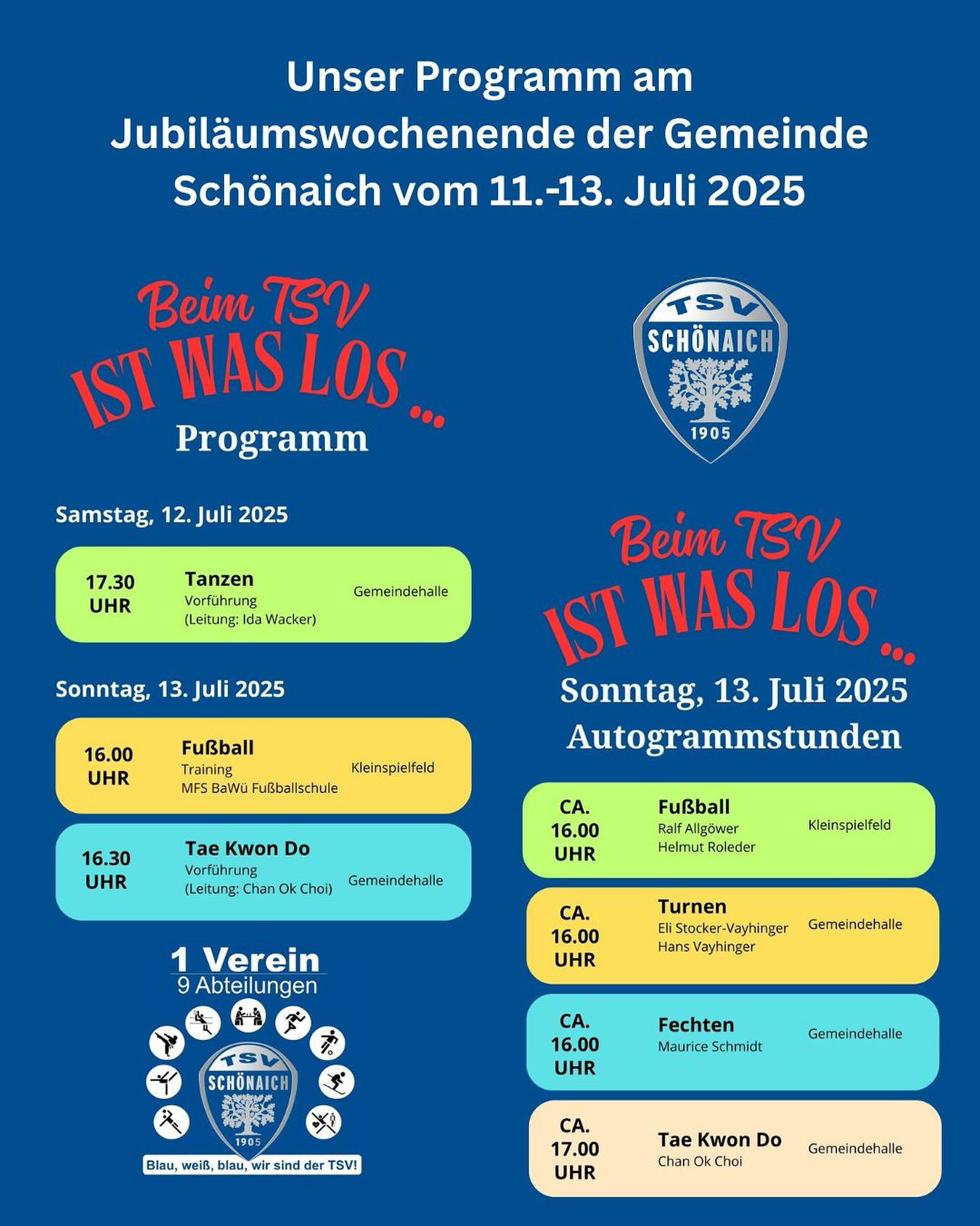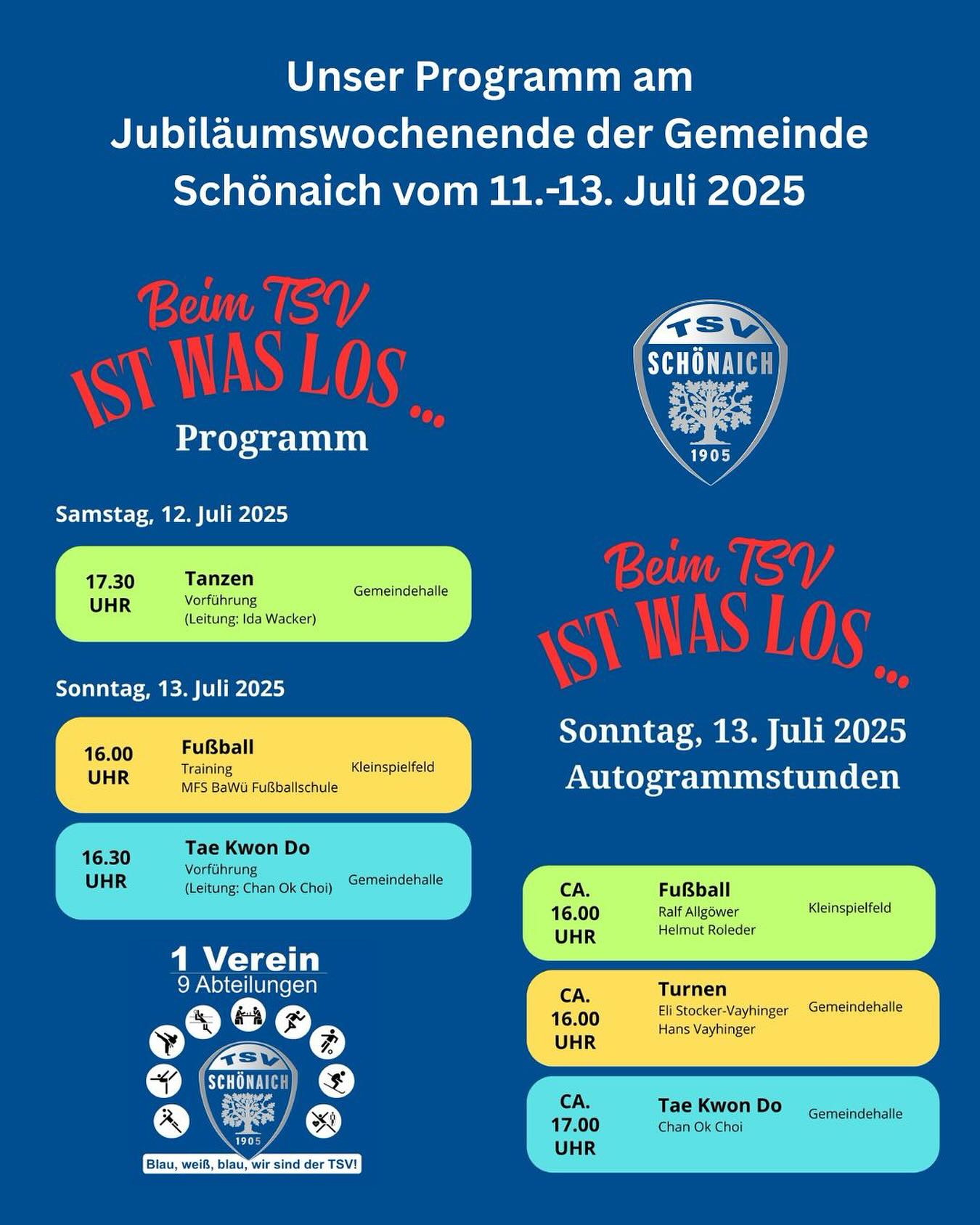 Für das Jubiläumswochenende der Gemeinde Schönaich haben auch wir uns etwas einfallen lassen. Neben einem Informationsstand in der Gemeindehalle, hat der TSV auch sonst noch einiges zu bieten. Das ganze Programm findet ihr auf unserer Webseite: www.schoenaich.de