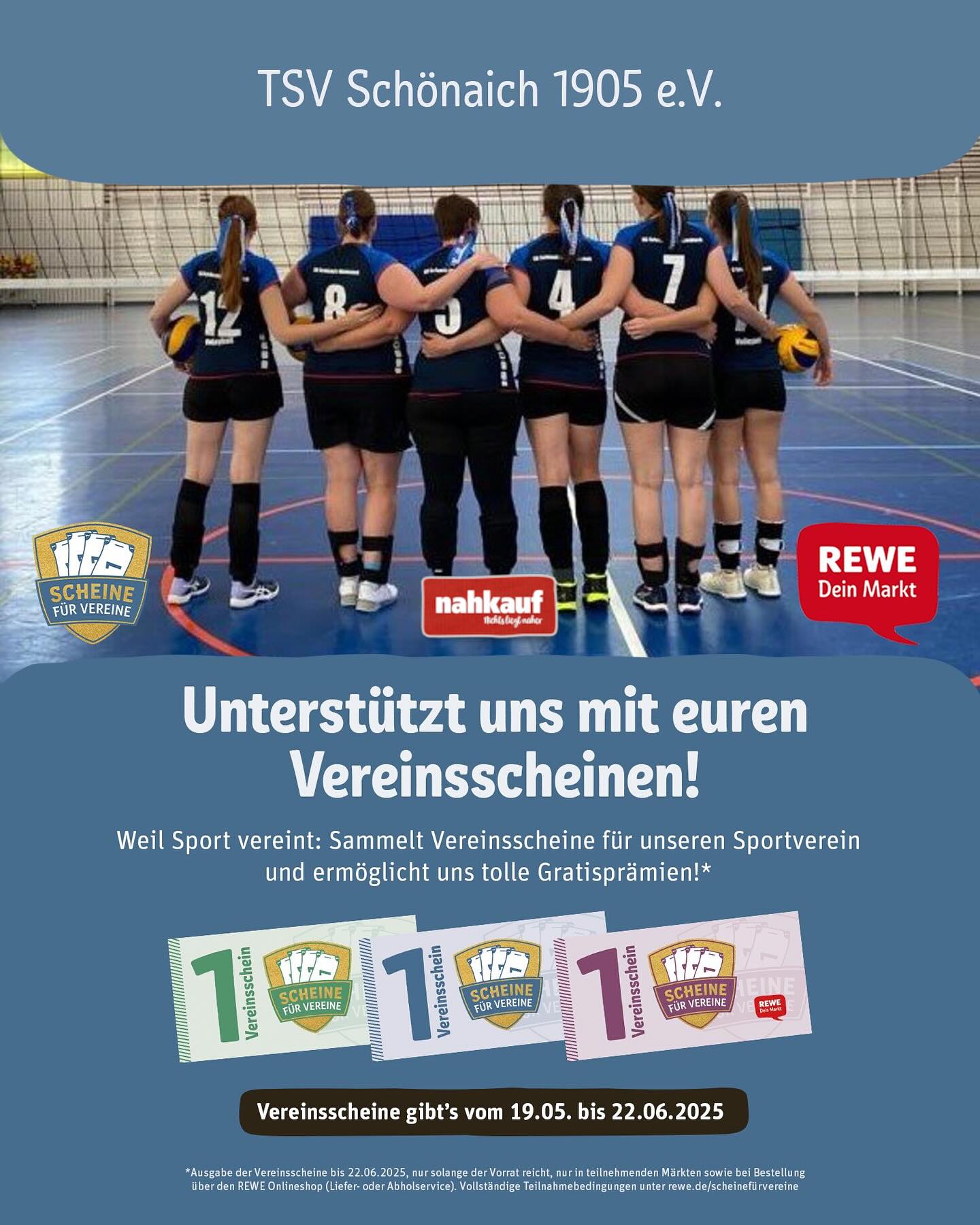 Am 19. Mai ist wieder die Aktion „Scheine für Vereine“ gestartet. Noch bis zum 22.06.2025 könnt ihr bei nahkauf in Schönaich und in den Rewe Filialen beim Einkauf (ab € 15) Scheine erhalten und eurem Verein zukommen lassen. Einfach danach fragen.