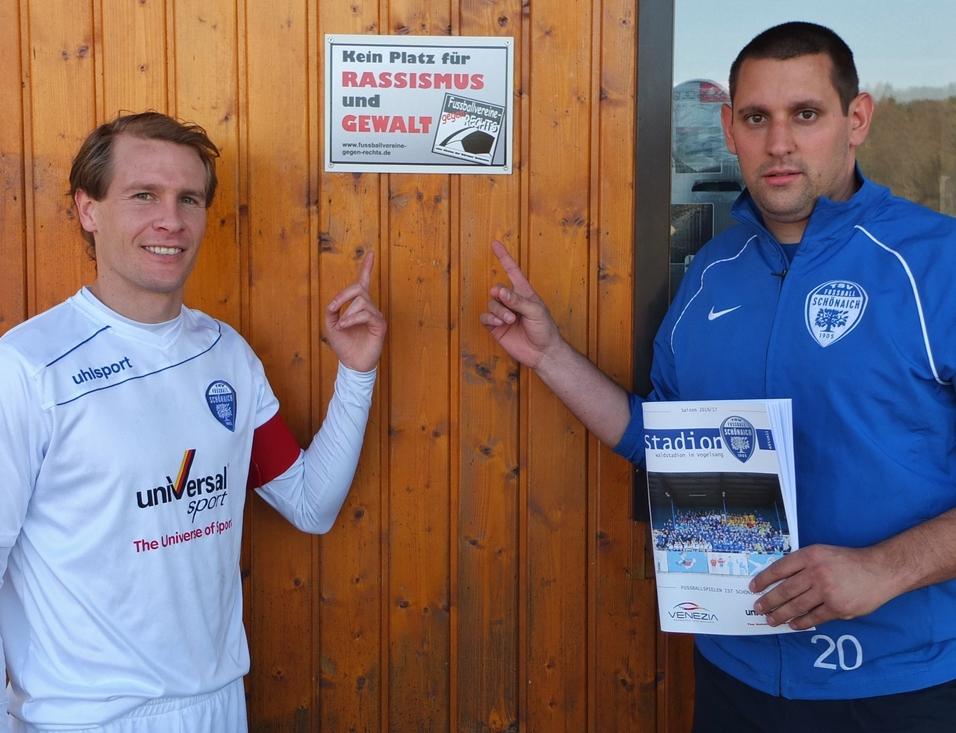 Mit der Beteiligung an dieser guten Aktion möchte sich die TSV-Fußballabteilung eindeutig gegen Rassismus und Gewalt stellen. Unsere Mannschaftskapitäne Jonas Sage (TSV I, li) und Fabio Tridico (TSV II, re) haben sich sofort bereiterklärt mitzumachen, und haben heute zwischen den Spielen gegen die Mannschaften des SV Rohrau stellvertretend für alle TSV-Fußballer eine entsprechende Tafel (siehe Foto) an unserem Stadionkiosk angebracht. Die Botschaft soll lauten: Kein Platz für Rassismus und Gewalt soll in Schönaich, soll in unserem Stadion, soll in unserem Verein sein!