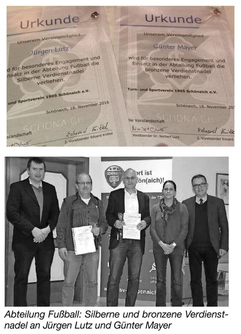 Am 18. November 2016 fand der diesjährige Ehrungsabend des TSV Schönaich statt. Nach einem Sektempfang und dem gemeinsamen Essen begrüßte der 1. Vorsitzende, Dr. Norbert Lurz, die anwesenden Gäste mit einem Rückblick und einem Statement über den TSV. Zusammen mit dem 2. Vorsitzenden Eduard Knittel nahm Dr. Norbert Lurz die Ehrungen vor. Für die Fußballabteilung wurden Günter Mayer und Jürgen Lutz für ihr besonderes Engagement für den TSV-Fußball mit der bronzenen-bzw. silbernen Ehrennadel ausgezeichnet.