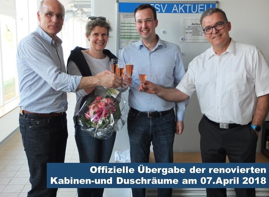 In einer kleinen Feierstunde konnte heute Architektin Ulrike Lutz die in siebenmonatiger Renovierungszeit auf einen tollen Stand gebrachten Kabinen-und Duschräume an den Vereinsvorsitzenden Dr. Norbert Lurz und Fußballabteilungsleiter Jürgen Lutz zur Nutzung übergeben.