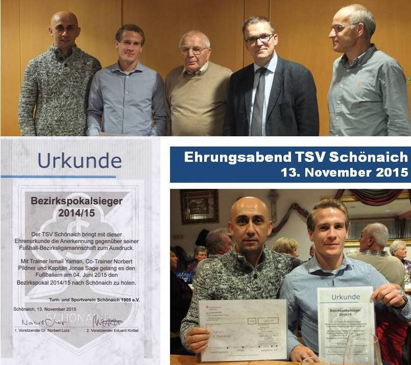 Viele Jubilare wurden beim TSV-Ehrungsabend 2015 für bis zu 60 Jahre Vereinsmitgliedschaft geehrt. Vereinsvorsitzender Norbert Lurz ließ es sich dabei nicht nehmen auch unser Bezirkspokalsieger-Team vom Juni diesen Jahres, vertreten durch den damaligen Trainer Ismail Yaman und Kapitän Jonas Sage (Co-Trainer Norbert Pildner war familiär verhindert) zu ehren, und für diesen schönen Erfolg einen 300€-Scheck für die Mannschaftskasse an Jonas Sage zu übergeben.