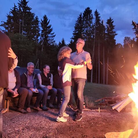 Bei Sekt, Bier und auch alkoholfreien Getränken saßen wir gemütlich beisammen. Als gegen später noch die Gitarren ausgepackt wurden, die Liederbücher verteilt und an der Feuerstelle richtig eingeheizt war, wurde sogar das Tanzbein geschwungen. Zu "Schifoan" von Wolfgang Ambros konnten alle textsicher mitsingen.